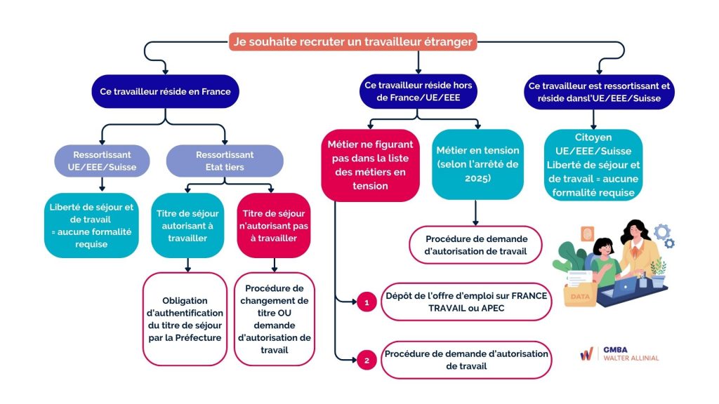 Attention : Certaines autorisations de travail sont limitées à un poste, un employeur ou une zone géographique déterminés. En cas de changement, il convient de s’assurer que l’autorisation reste valable et, si nécessaire, de respecter les démarches applicables (comme la publication de l’offre via France Travail ou le recours à la procédure « métiers en tension »).